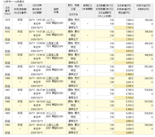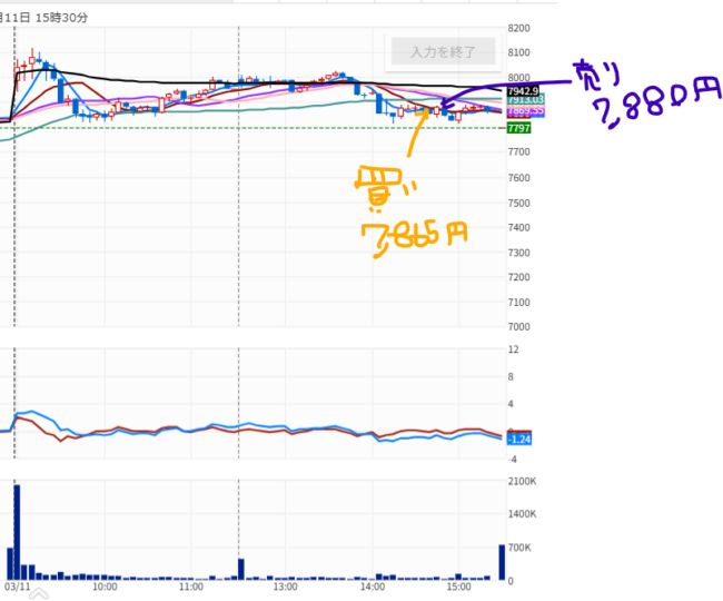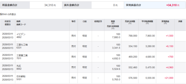 ・イビデンを100株、7,865円で購入し、7,880円で売却。