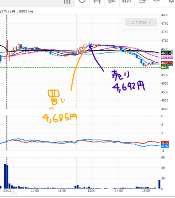 ・三菱重工を100株、4,685円で購入し、4,692円で売却。