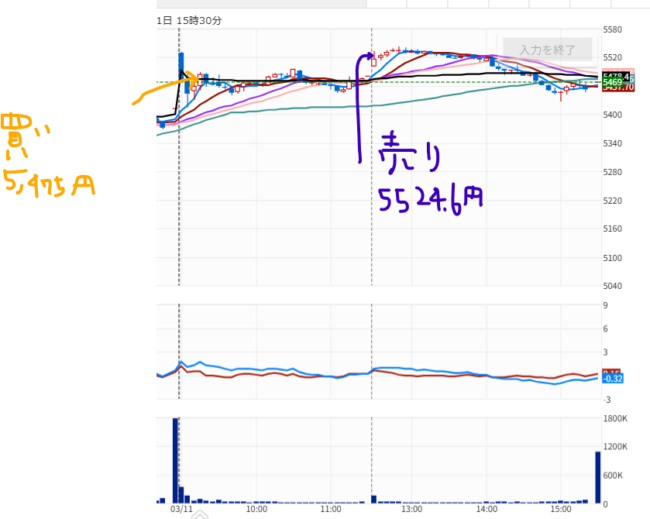昨日も午前中は強い動きだったので、今日も寄り付きから上昇することを予想してエントリーし、前日の反省を踏まえて早めに利確しました。
