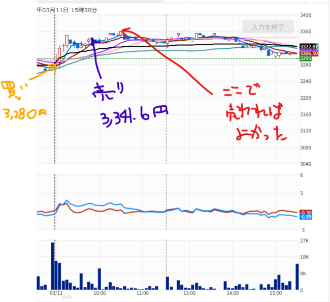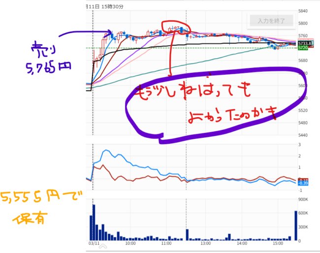 しかし午前中は思ったような動きにならず、慎重に売却するか迷いましたが、「明日に持ち越してもよい」と考えてそのまま午後へ持ち越しました。