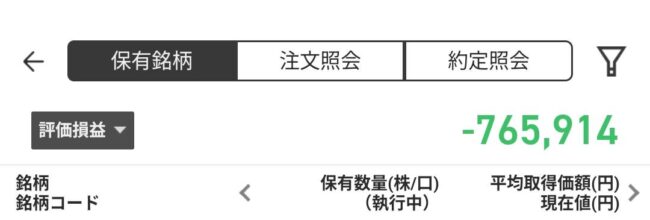 評価損益は-765,914円となり、今日も含み損が膨らむ結果になりました。
