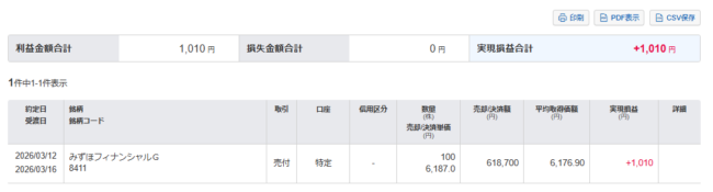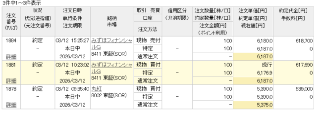 ・みずほフィナンシャルGを100株、6,176.9円で購入し、6,187円で売却。
