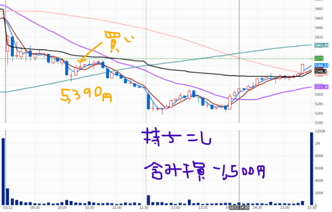 後半になってようやく持ち直し、株価が上向き始めたところで「少しでもプラスになったら今日は終わりにしよう」と決め、指値を入れて約定したのが15:30でした。