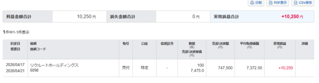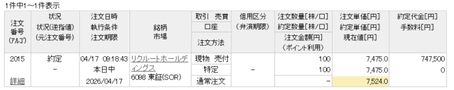 ・リクルートを100株、7,372.5円で保有、7,475円で売却