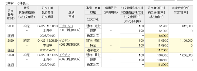 ② 4/22(水)の約定状況・損益のまとめ