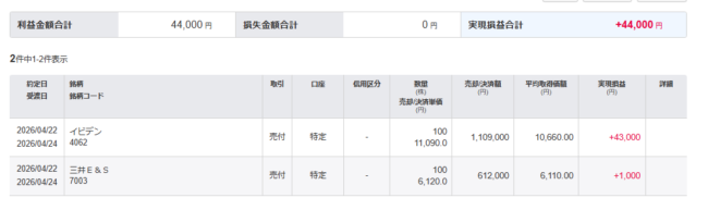 ・イビデンを100株、10,660円で購入、11,090円で売却